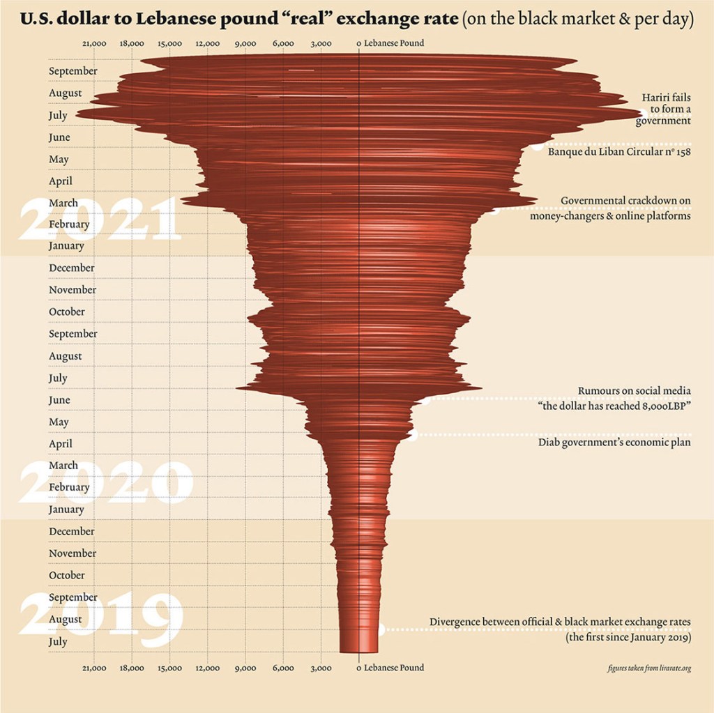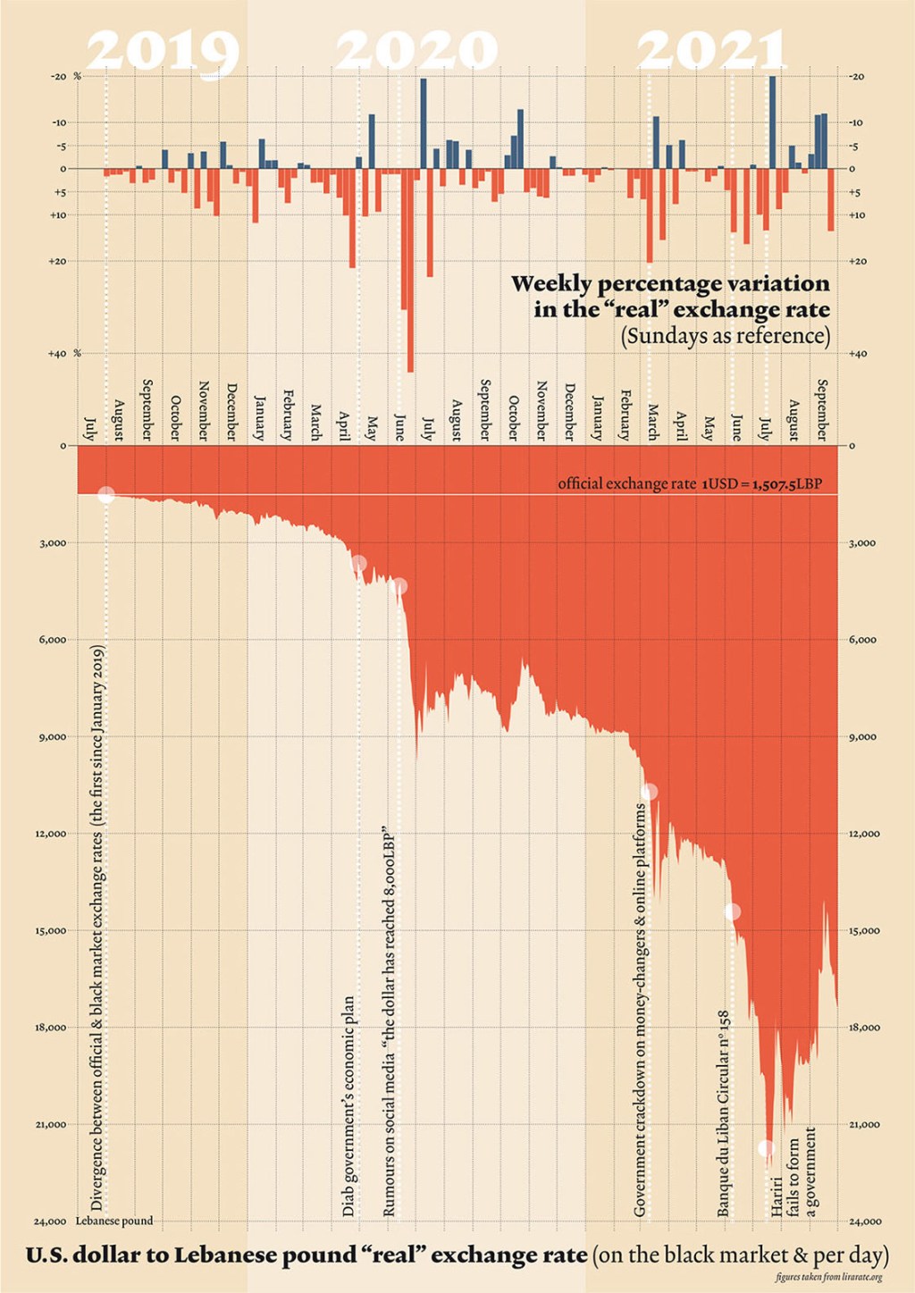 The fourth plateau, 15,000-18,000LBP, was reached differently. On June 8, 2021, Banque du Liban issued Circular no. 158, which basically allows small depositors to withdraw per month 400USD in USD and 400USD in LBP at the rate of 3,900LBP (another financial ingenuity by the central bank, still it seemed to progress to the previous situation). Banks went on steroid mode hoarding dollars from the black market. It wasn’t the first time that banks were speculating on the black market. Putting aside the first few months of the crisis, banks seem to be major players on the black market. However, it’s hard to exactly identify and evaluate their role and actions. Ah, and by the way, Circular no. 158 is still not yet properly implemented. The only political event that had a major impact on the exchange rate occurred in the middle of the fourth plateau with the failure of Hariri to form a government after being designated for this task 11 months earlier (the US dollar skyrocketed past 22,000LBP). Nearly one year of waiting, nothing as an outcome, frustration, fear, anxiety, lack of hope… at the end, it seems that effects coupled with speculation are the main drivers for the fluctuations in the exchange rate. But this in no way absolves the political and economic ground which allowed them to foster.