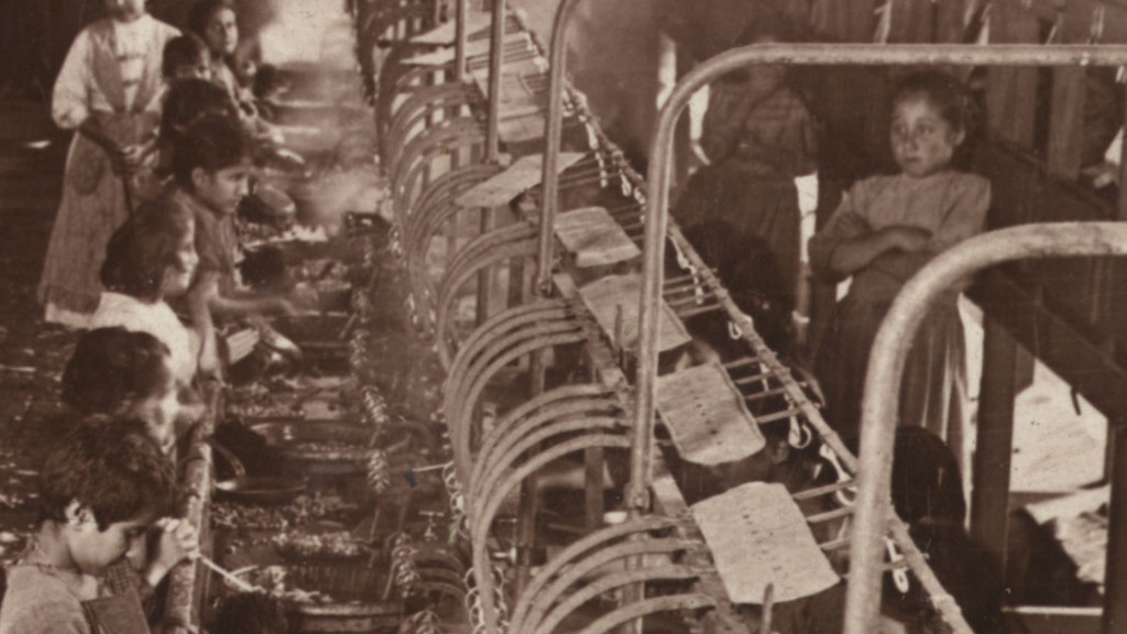 For capital, they were the ideal workers, cheap and controllable. They cost one-tenth of an adult male worker, and they can do the same job, even better. Their tiny figures can be squeezed easily into the entrails and the sides of the machine, therefore increasing productivity. And if they were smaller, no problem. They just made them stand on a low table, like the girl wearing a kerchief at the left of the photo. This white kerchief was what peasant men and women wore on their heads while working the fields (women tied the knot at the back, men at the front). These white kerchiefs in a factory show the transition from peasantry to factory workers.